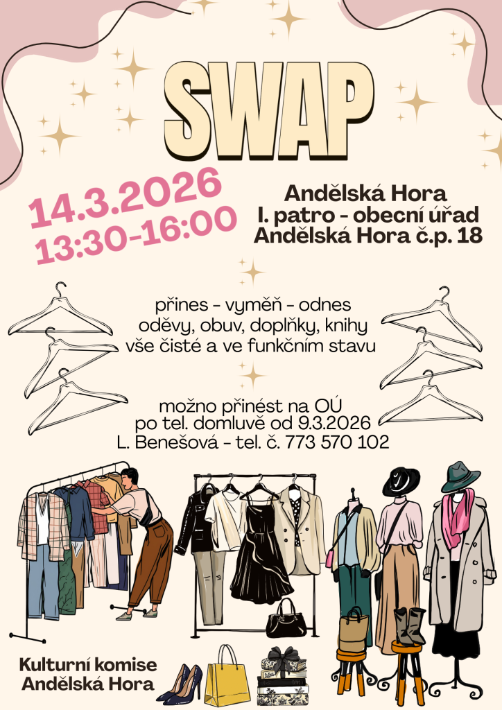 Přineste oblečení, doplňky, knihy či další věci do domácnosti, které již nepotřebujete, a vyměňte je za nové kousky. Akce je určena pro všechny, kteří chtějí obohatit svůj šatník nebo domácnost. Věci můžete nosit na obecní úřad od 9.3.2026 po telefonické domluvě. tel.č. L.Benešová 773570102